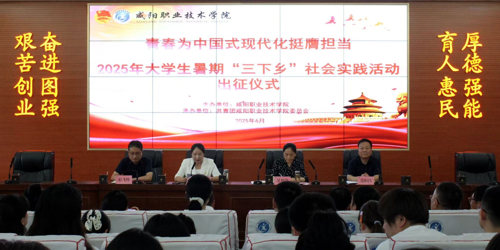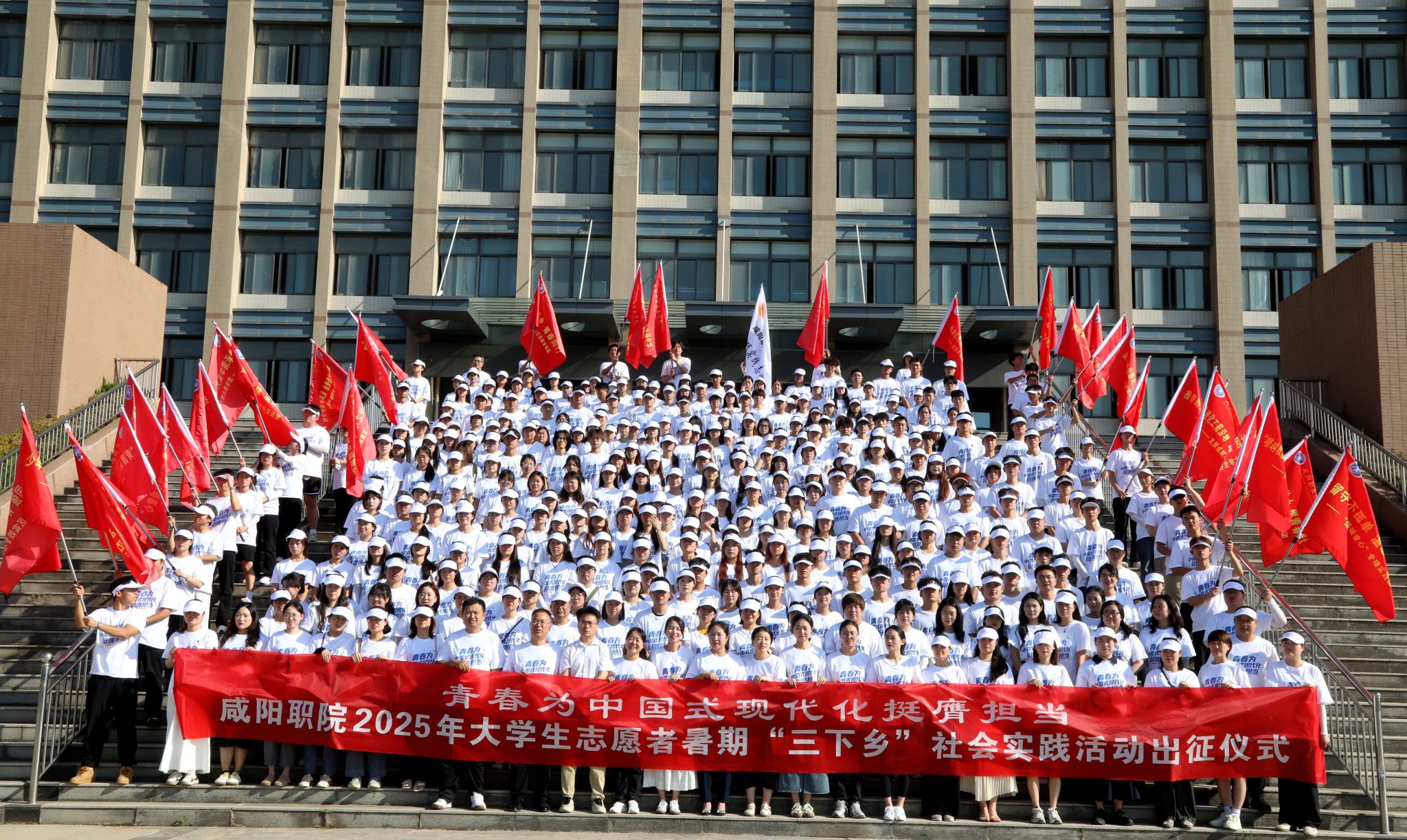 为深入引导青年学生了解国情、服务基层,6月27日,咸阳职院举行2025年大学生志愿者暑期文化科技卫生“三下乡”社会实践活动出征仪式。学院副院长吴旭锦,组织人事处、学生处负责人,各二级学院党总支书记、副书记、团总支书记,立项团队全体指导教师及学生代表共300余人参加。