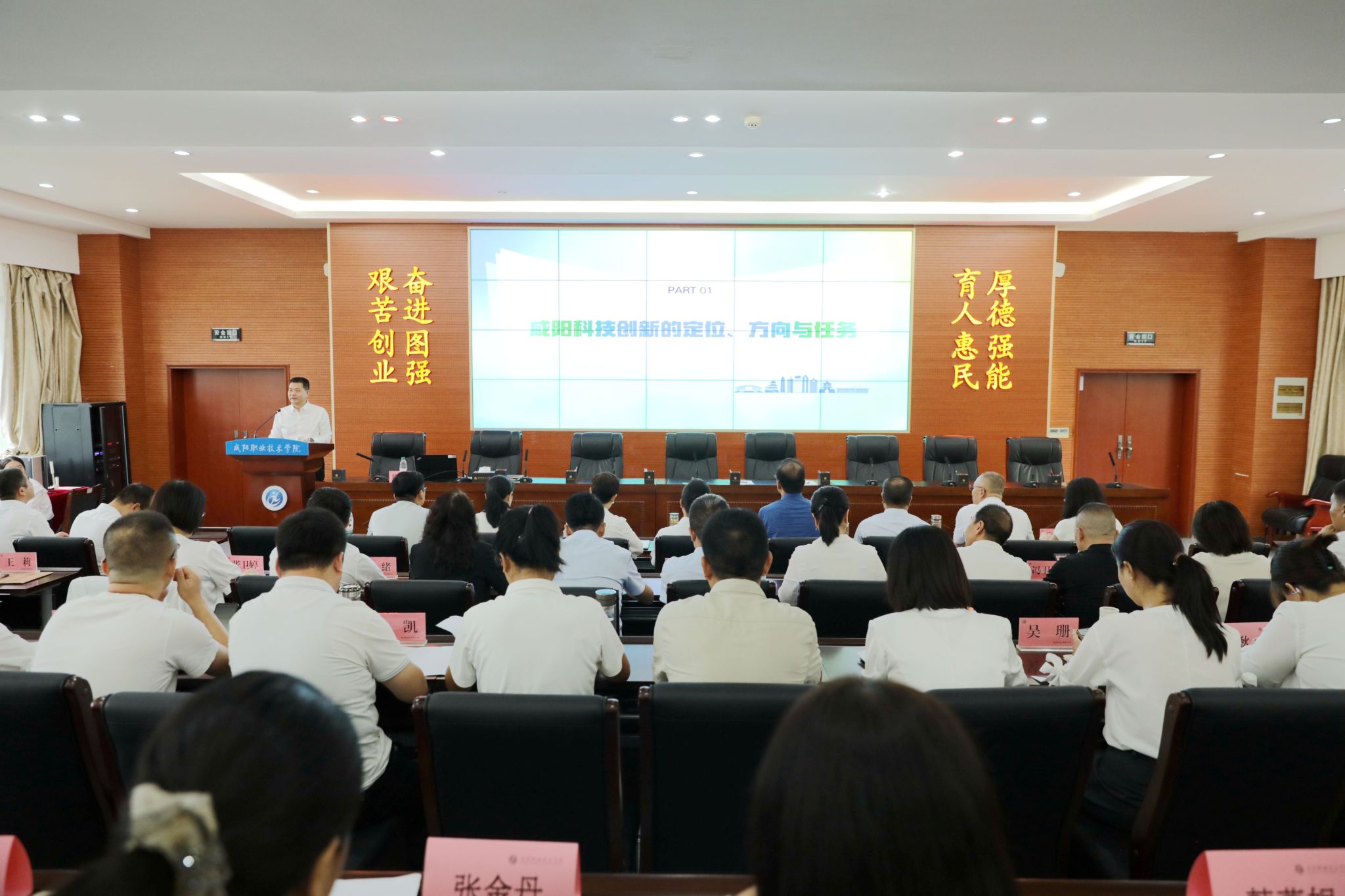 9月16日上午,咸阳职院邀请咸阳市委科技工委书记、咸阳市科技局局长杨冲锋来院作题为“创新引领发展”专题报告。学院院长杨卫军主持并讲话,学院党委副书记、工会主席孙彦彬,党委副书记赵维,副院长芮红亚、杨新宇、吴旭锦,纪委书记王宇文,各二级学院院长、副院长、全体教授、博士等近200人聆听报告。