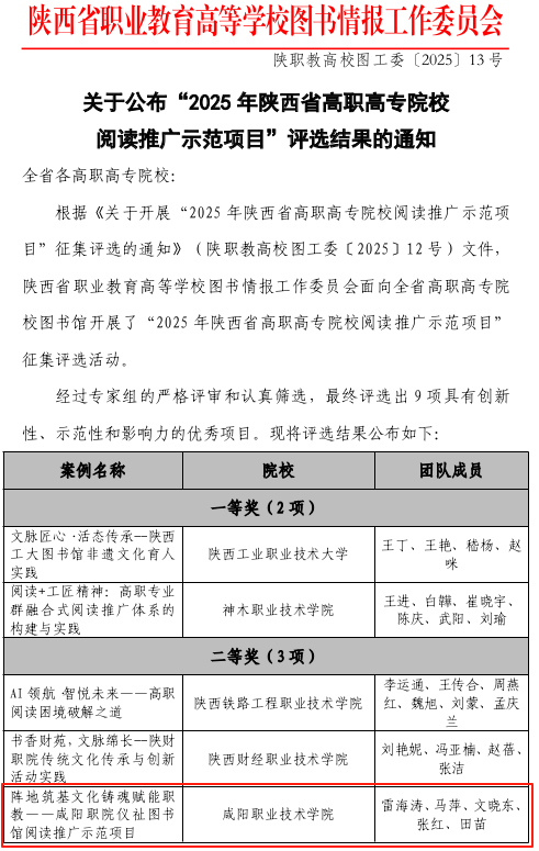 近日,陕西省职业教育高等学校图书情报工作委员会公布“2025年陕西省高职高专院校阅读推广示范项目”评选结果,beat365英国官网网站图书馆雷海涛、马萍、文晓东等提交的《阵地筑基 文化铸魂 赋能职教——咸阳职院仪祉图书馆阅读推广示范项目》案例凭借鲜明特色、扎实成效与创新模式脱颖而出,荣获二等奖,实现了在该奖项的零突破,充分彰显了学院在阅读推广工作中的专业实力与育人成效。