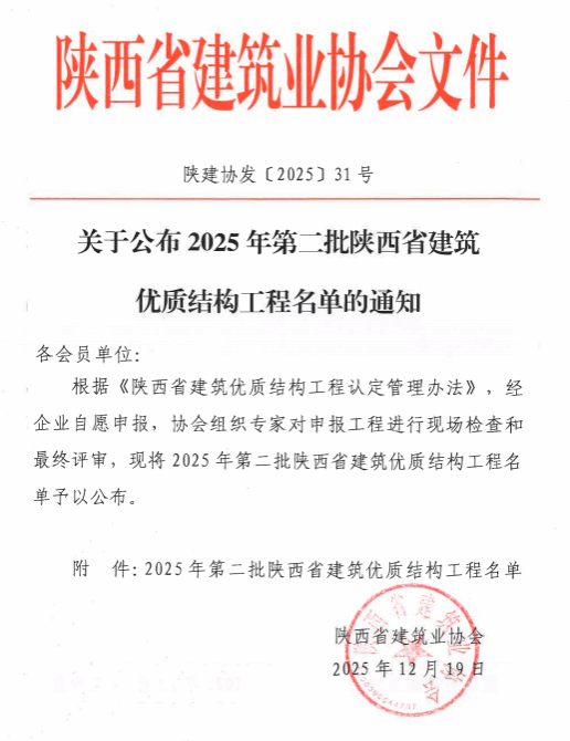 近日,陕西省建筑业协会公布了“2025年第二批陕西省建筑优质结构工程”名单,beat365英国官网网站12#学生公寓项目被评为2025年“陕西省建筑优质结构工程”。