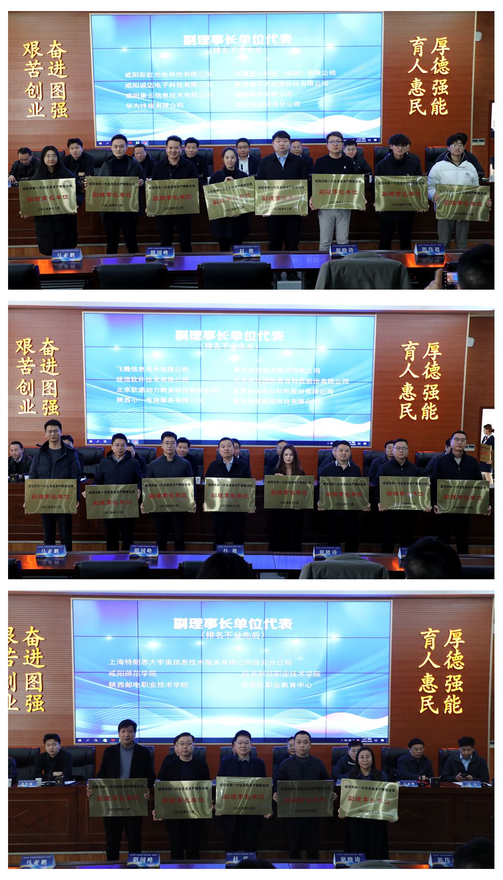 随后,大会举行授牌仪式,与会领导为联合体特聘专家、行业导师颁发了聘书;为副理事长单位、副秘书长单位授牌。审议环节,与会代表们一致通过了《咸阳市新一代信息技术产教联合体章程》,明确了联合体的组织架构、运行机制以及成员单位的权利与义务。会议还促成了多项校企合作协议的签订。