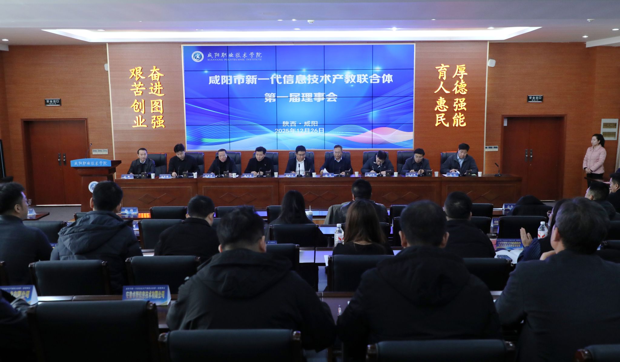 12月26日,beat365英国官网网站院务楼二楼多功能报告厅座无虚席,咸阳市新一代信息技术产教联合体第一届理事会在此举行。咸阳高新区党工委委员、管委会副主任琚晓涛,咸阳职院党委副书记赵维,中共咸阳市委网信办总工程师郭伟超、网安科科长阴国峰,咸阳市教育局四级调研员李敢创,咸阳市工业和信息化局四级调研员马亚鹏,高新区管委会科技创新局局长冯伟,彩虹显示器件股份有限公司规划科技部经理李聪,咸阳师范学院、陕西财经职业技术学院等6所院校代表,咸阳彩虹光电科技有限公司、冠捷显示科技(咸阳)有限公司等57家企业代表,以及咸阳职院相关处室、信息工程学院负责人和教师代表参加。会议分为理事会议与产教融合发展论坛两个阶段。