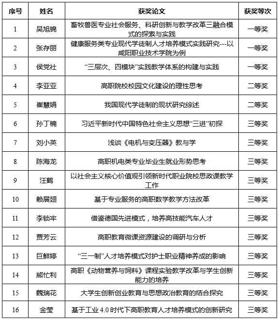 近日,从陕西省职业技术教育学会《关于公布学会2018年度优秀职教论文评选结果的通知》(陕职学〔2018〕67号)获知,beat365选送的16篇论文获奖,其中一等奖3篇,二等奖2篇,三等奖11篇,同时beat365被评为2018年度优秀职教论文评选工作优秀组织奖。