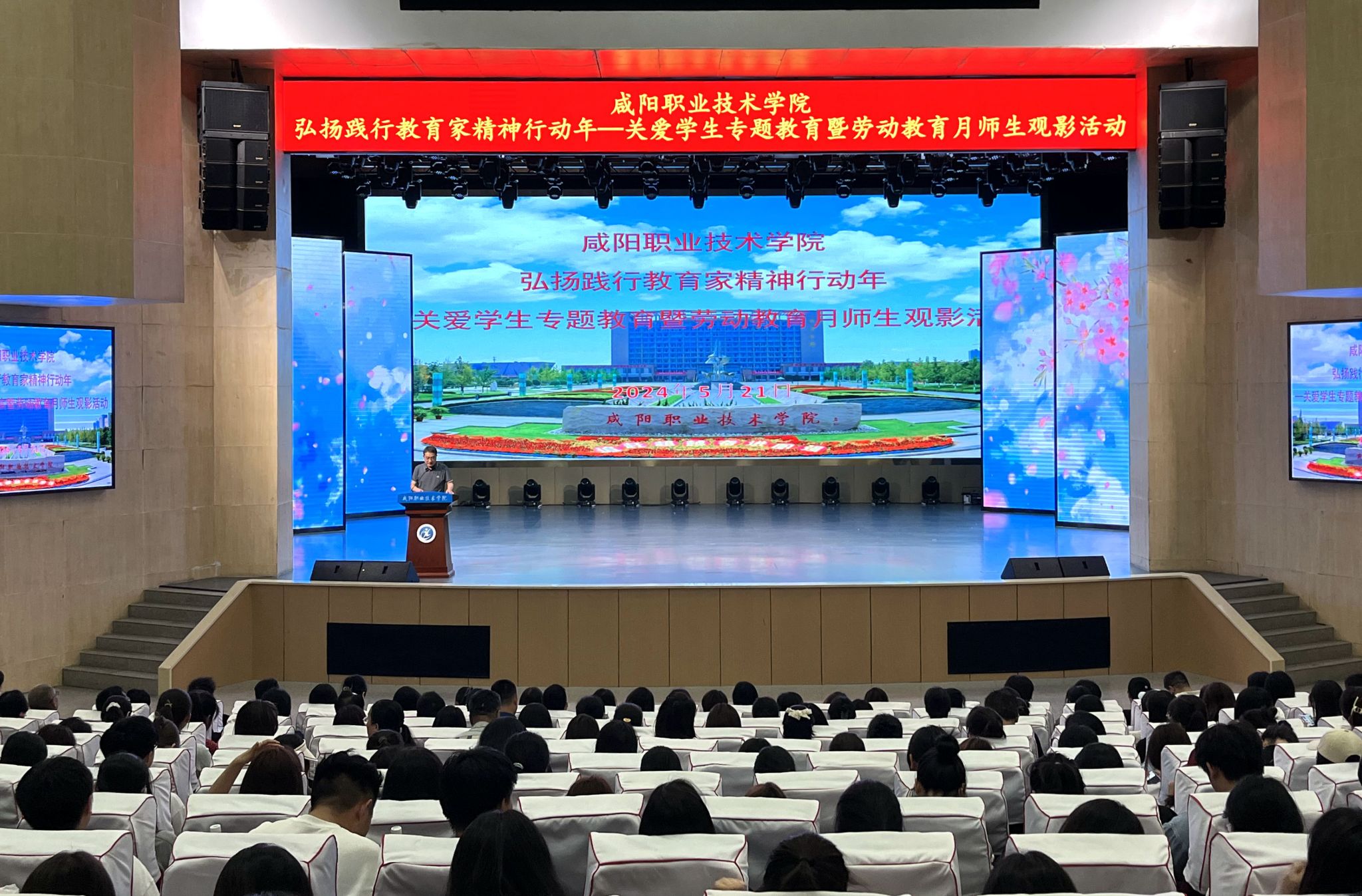 5月21日下午,咸阳职院举办弘扬践行教育家精神行动年——关爱学生主题教育暨劳动教育月师生观影活动。学生处、各二级学院学工人员、全体辅导员(班主任)及学生代表共计500余人参加活动。