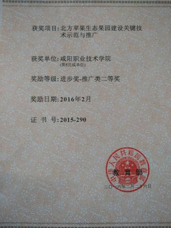据教育部《关于2015年度高等学校科学研究优秀成果奖(科学技术)奖励的决定》(教技〔2016〕1号)获悉,咸阳职院教师刘建海等作为第8参与人,咸阳职院作为以第5完成单位参与的由西北农林科技大学李丙智教授主持的《北方苹果生态园建设...