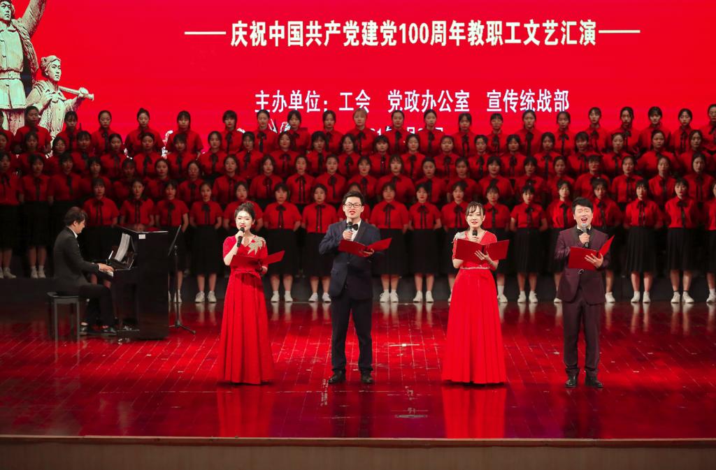 演出在歌伴舞《祖国万岁》中拉开序幕,以舞寄情,用翩跹舞姿呈现春风化雨、国富民强的时代画卷。《没有共产党就没有新中国》《走进新时代》《歌唱祖国》等合唱歌曲,以歌颂党,用嘹亮的歌声礼赞党的百年征程,诠释初心永恒。《我把最小的娃娃送上了战场》《因为有你》《我骄傲我是中国人》等配乐诗朗诵,以诵言志,用诚挚的语言、饱满的情感赞颂共产党人的崇高信仰,追溯建党百年的光荣历史。《我爱你中国》模特秀表演,老年大学成员以饱满的热情翩翩起舞,为建党100周年献礼。演员们精神饱满、全情投入,用精彩的演出,为师生们上了一堂生动的“党史课”。演出在全体师生共唱《没有共产党就没有新中国》的嘹亮歌声中圆满落幕。