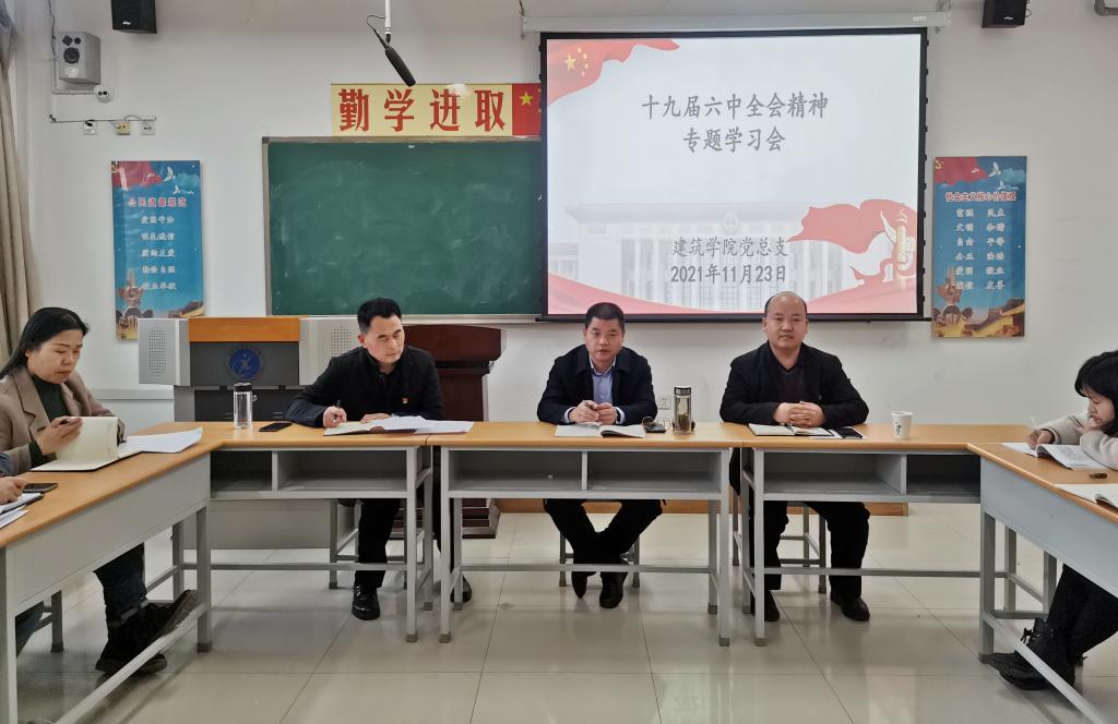 会议集中学习了《中国共产党第十九届中央委员会第六次全体会议公报》。建筑学院党总支书记邢剑宏和建筑学院党总支副书记、院长雷海涛分别做了学习心得体会交流发言。