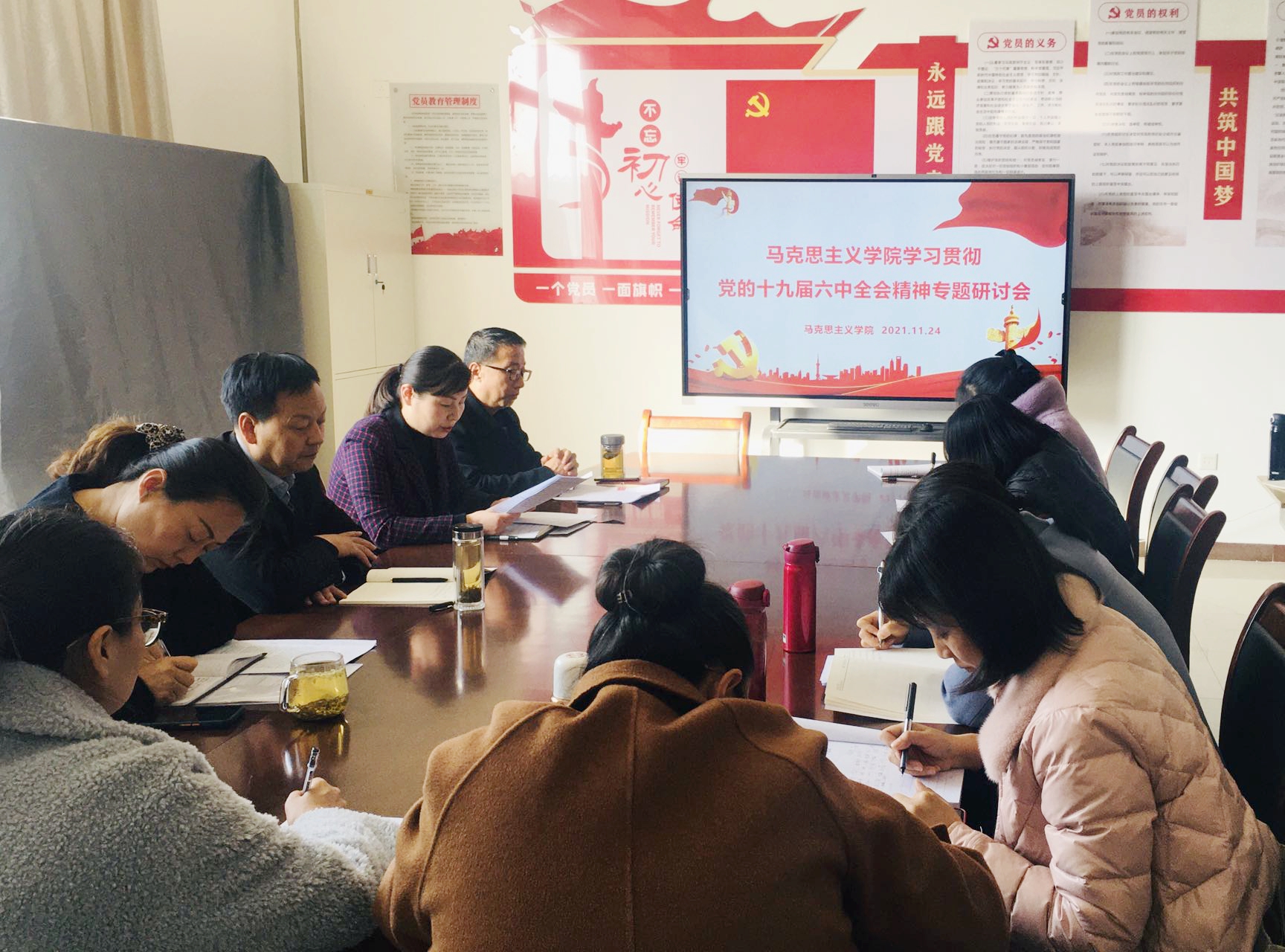 会议集体学习了《中国共产党第十九届中央委员会第六次全体会议公报》、《中共中央关于党的百年奋斗重大成就和历史经验的决议》和《中共咸阳职院委员会党的十九届六中全会精神学习宣传贯彻工作方案》。与会人员结合马克思主义学院工作,对全会内容进行了交流研讨。大家一致认为,在建党百年之际,党中央召开十九届六中全会,全面总结党的百年奋斗重大成就和历史经验,深刻回答了新时代党和国家事业发展的重大理论和实践问题,为推进中华民族伟大复兴历史进程提供了强大思想武器、指明了前进方向,是郑重的历史性、战略性决策。要深入贯彻党的十九届六中全会精神,高质量推进马克思主义学院各项工作,努力在新时代新征程上展现新气象新作为。