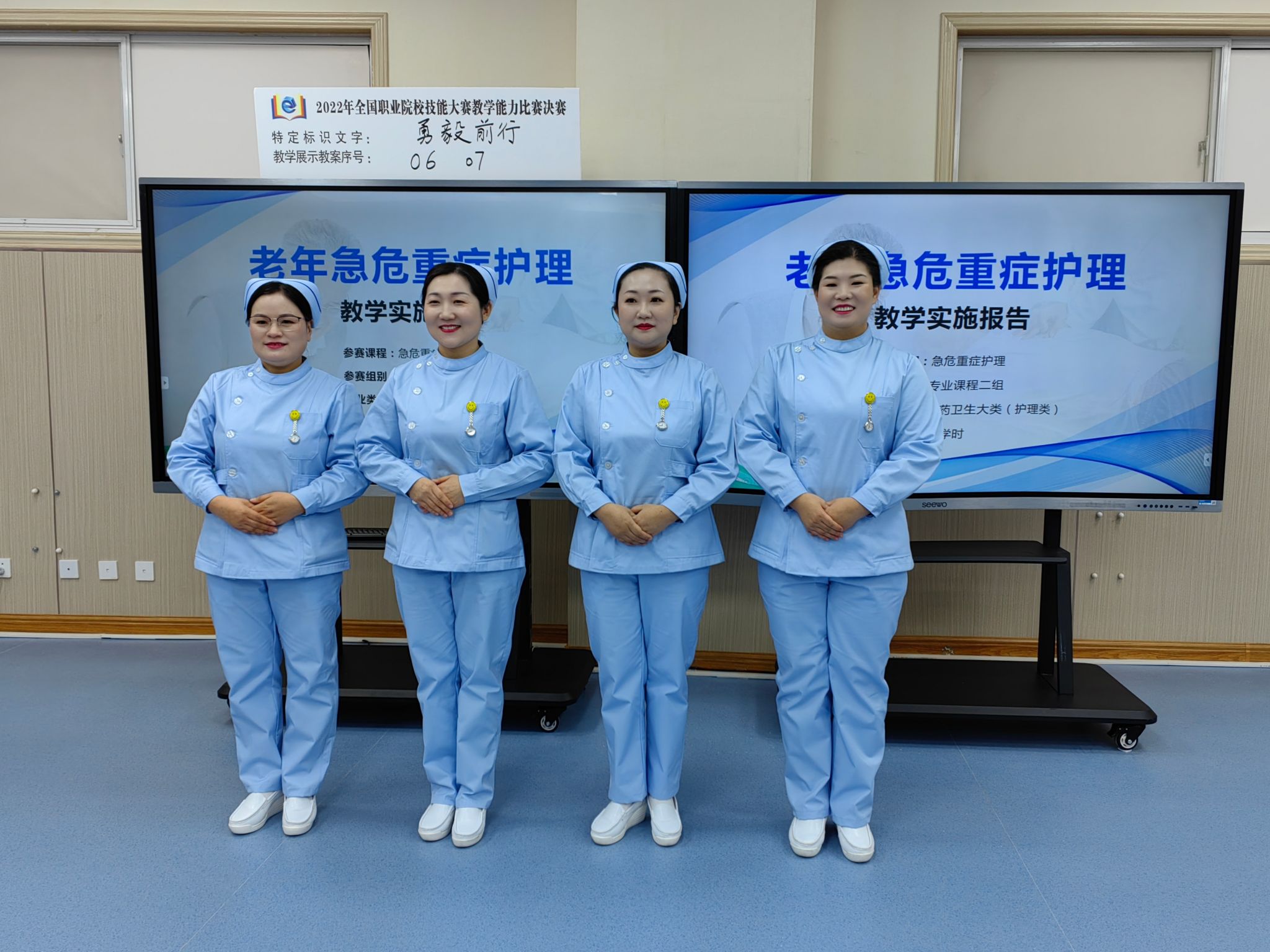 《老年急危重症护理》教学团队在2022年全国职业院校技能大赛教学能力比赛中荣获一等奖。该团队贯彻落实立德树人根本任务,探索“ 岗课赛证” 综合育人,创设“四级进阶”实践训练模式,构建“点—线—面”课程思政体系,创建智慧养老护理服务平台,有效促进学生全面发展。团队成员4人,其中教授1人,副教授1人,讲师2人。硕士4人,双师型教师 4人,骨干教师2人。